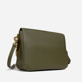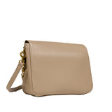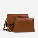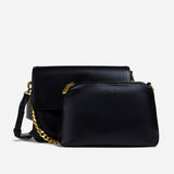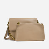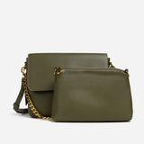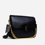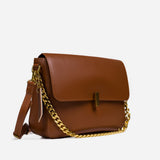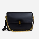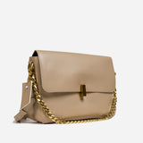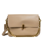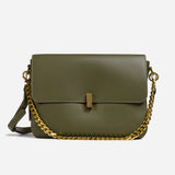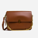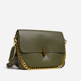 The bag features a spacious, single compartment that provides ample room for your essentials, while a separate internal pouch ensures your important items remain organized and easily accessible. The flap is secured with a stylish twisted buckle, adding an extra layer of refinement to the overall aesthetic. A metallic chain serves as the top handle, allowing for effortless carrying with a touch of grace and poise.